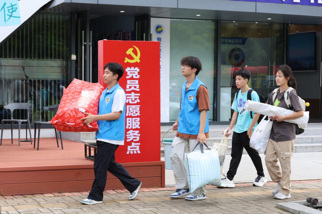 迎新背后,是学校各部门协同作战、高效运转的强大支撑。学工人员将关心融入每一个细节,从学业规划到生活指导,提供全方位支持;保卫人员全天候值守,严密指挥交通,强化校园安全巡逻;校团委组织志愿者化身“迎新摆渡人”,搬运行李、指引路线,全程伴行,以微笑传递温度,用行动诠释担当;后勤和产业部门精心保障新生们衣食住行的便利与舒适,提供便捷高效的交通服务,为师生们营造了安全有序的校园环境。在迎新期间,更是涌现出温情瞬间:一位家长的车辆突发故障时,附近的志愿者与工作人员毫不犹豫地上前伸出援手,合力推车至修理点,共同克服困难,解决了其燃眉之急,也展现了海大人互助友爱的精神风貌。