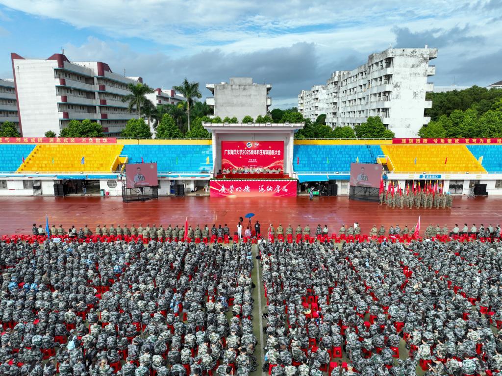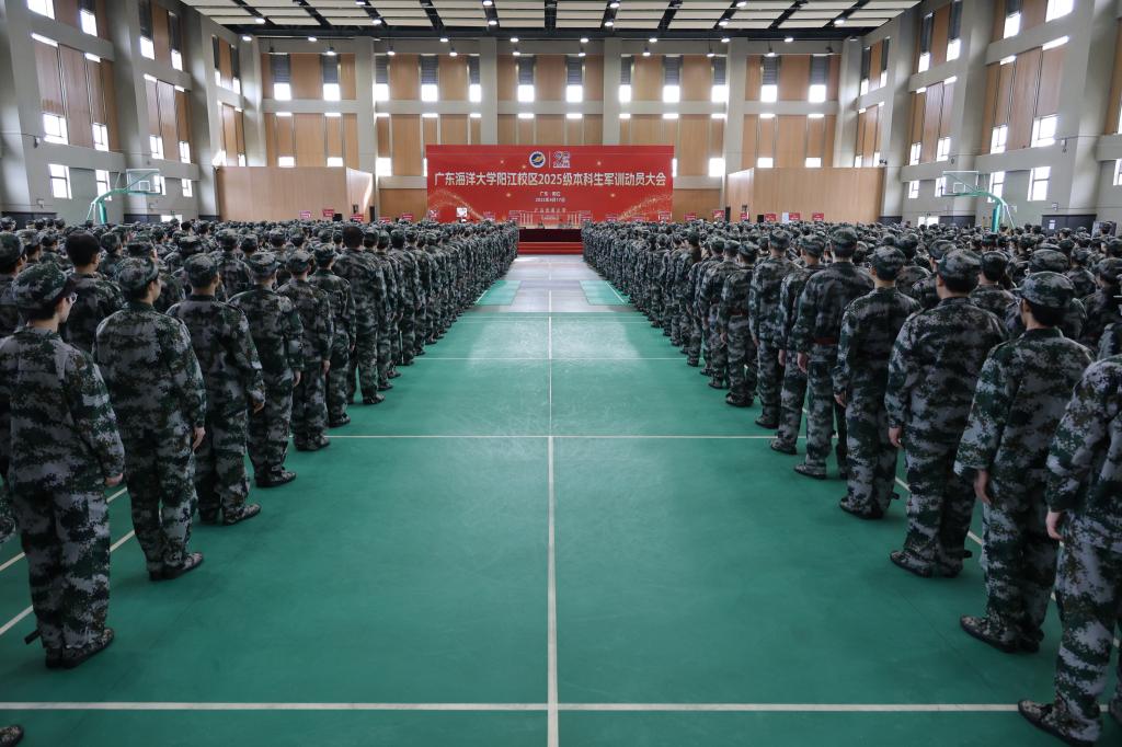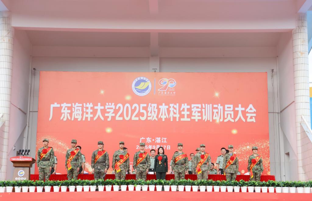 9月17日上午,学校在湖光校区东区运动场、阳江校区海阳馆举行2025级新生军训动员大会。学校党委书记杨洲,党委常委、副校长周昌仕分别作开训动员讲话。学校党委副书记谭平宣读军训旅机构设置情况及各营营长、教导员名单。学校党委常委、副校长、军训旅旅长鲁义善主持湖光校区大会,阳江校区党委副书记、军训团团长丁永成主持阳江校区大会,阳江校区党委副书记麦冬宁宣读各军训营营长、教导员名单。军训旅副政委、副旅长,各学院分管学生工作领导,全体教官,负责带训的辅导员和班主任,湖光校区、阳江校区2025级本科生现场参会。海滨校区2025级本科生通过线上直播形式参加大会。