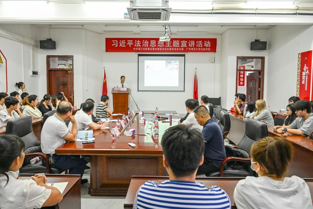 揭牌仪式结束后,学习宣传阵地第一次主题宣讲活动在博文楼A座405室举行,法政学院张继钢教授作习近平法治思想主题宣讲。湛江市司法局和麻章区司法局有关领导、麻章区“法律明白人”、法政学院学生等80余人参加活动。