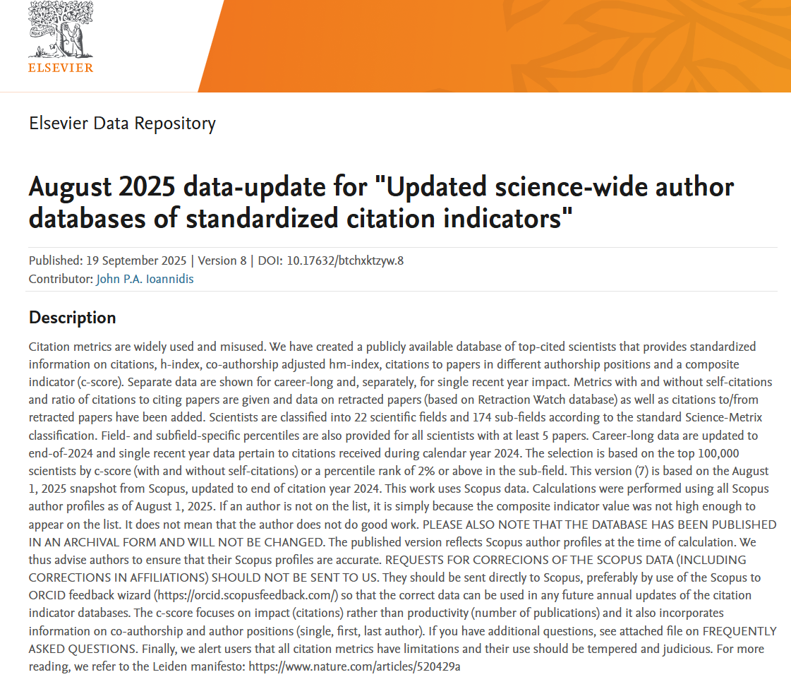 据了解,全球前2%顶尖科学家榜单分为“终身科学影响力排行榜(Career-long Impact)”和“年度科学影响力排行榜(Single-year Impact)”两大部分,从全球近700万名科学家中,通过基于其论文引用数、h因子、合著者修正的hm因子、单独或第一作者的文章引用数等综合参数,遴选出世界排名前2%的科学家,涵盖22个领域和174个子领域。其中,“终身影响力”榜单统计科学家职业生涯期间的综合表现,“年度影响力”榜单则聚焦上一年度的学术影响力。入选榜单,意味着该学者在其研究领域具有较高的世界影响力。