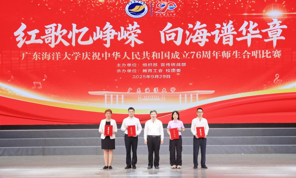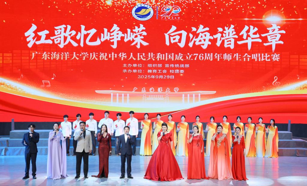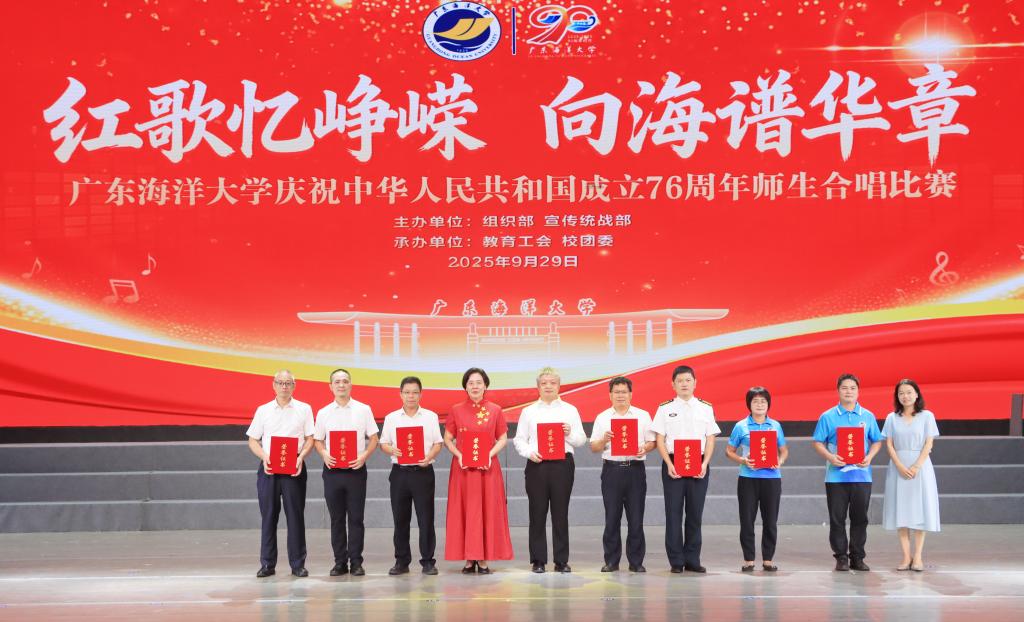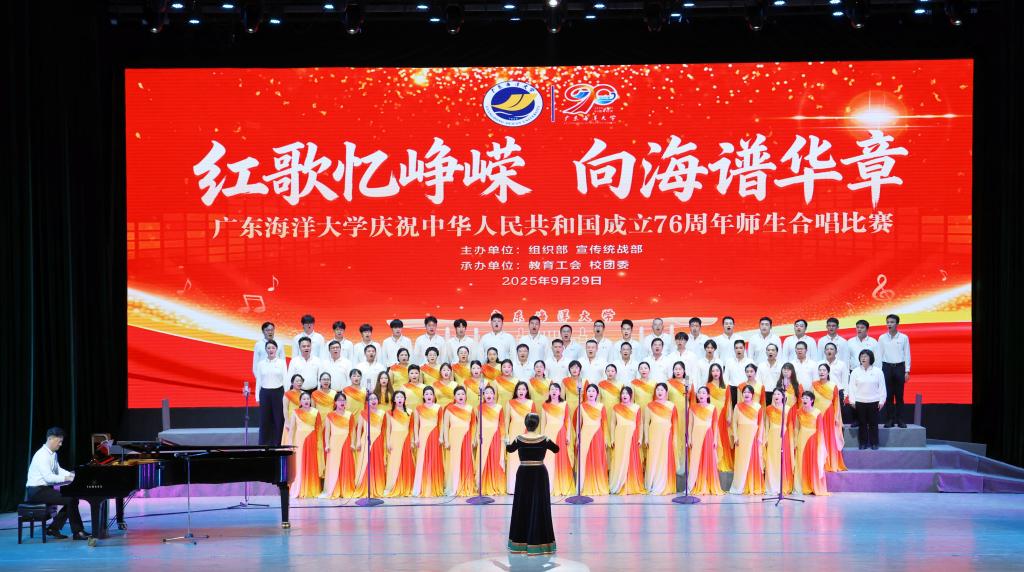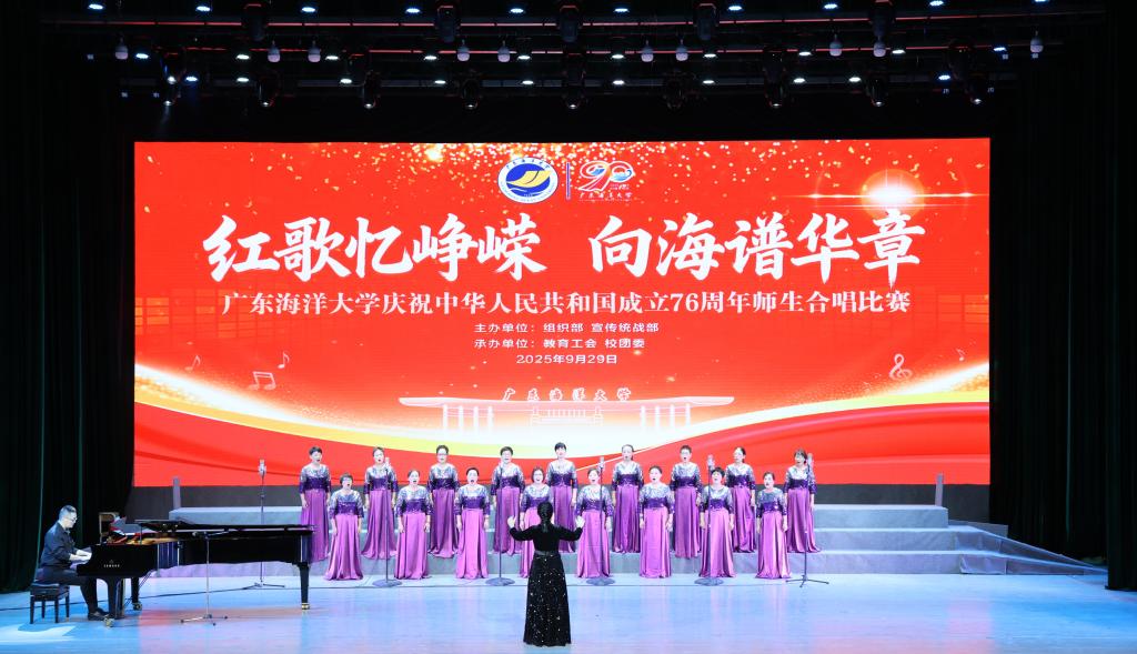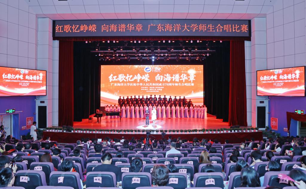 为庆祝新中国成立76周年、学校建校90周年,9月29日,学校在湖光校区实验剧场举行“红歌忆峥嵘,向海谱华章”师生合唱比赛,厚植爱国主义情怀,凝聚奋进力量。学校党委书记杨洲,党委副书记谭平,党委常委、副校长宁凌、邓逢光、周昌仕,党委常委、宣传统战部部长林宇,全体中层干部、师生代表现场观看比赛。阳江校区通过企业微信直播平台线上观看比赛。