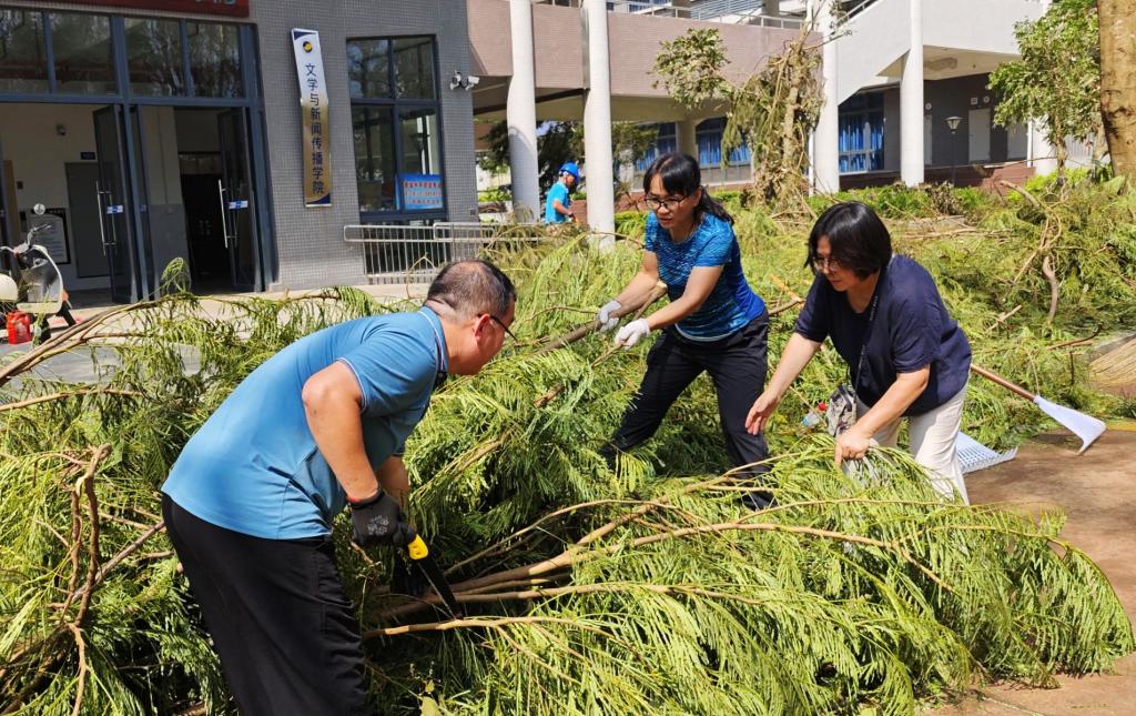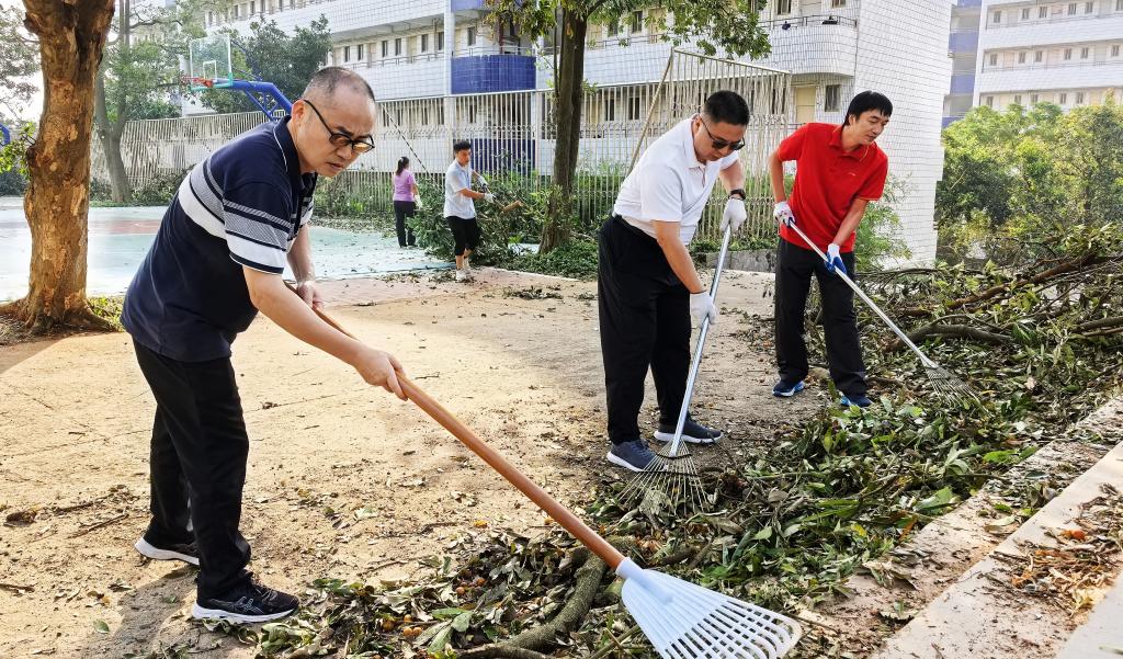 校领导杨洲、邓逢光、鲁义善实地检查了校园各处的灾后重建情况,对树木倒伏严重、积水隐患突出的重点区域进行现场指导,提出了科学高效的清理要求。校领导们还加入到师生队伍中,与大家一同搬运断枝、清扫落叶、清理积水。