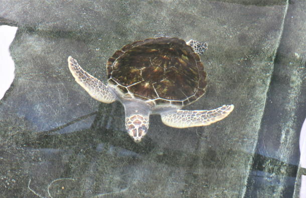 身形较小的一只绿海龟身长约40厘米,宽约35厘米,重约20斤,无明显外伤。但因其长时间待在空间狭窄的海鲜池内,导致野外生存能力下降,可能无法自行捕食。如果被放归大海后,很可能会游回浅滩向人类求食,但这样就很容易被船舶螺旋桨或其他机械伤害。目前这只幼龟身体和精神状况良好,正在救护基地接受捕食等相关适应性训练。