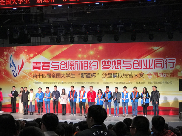 11 月 9 日至 11 日,由高等学校国家级实验教学示范中心联席会经济与管理学科组主办、中南财经政法大学承办、新道科技股份有限公司提供技术支持的第十四届全国大学生“新道杯”沙盘模拟经营大赛全国总决赛在中南财经政法大学隆重举行。本次大赛共有来自全国各地本科院校的 130 支队伍参赛,其中参赛院校 127 所,参赛人数达650余人。开云官网代表队由管理学院2016级本科生王凌鑫、林淙铉、黄浩城、谭丽婷、刘泽华五名同学组成,代表队在校团委、学院领导的大力支持和指导老师孟飞荣的指导下,在省赛中获得了一等奖,成功晋级此次全国总决赛,并取得了国赛二等奖的好成绩。