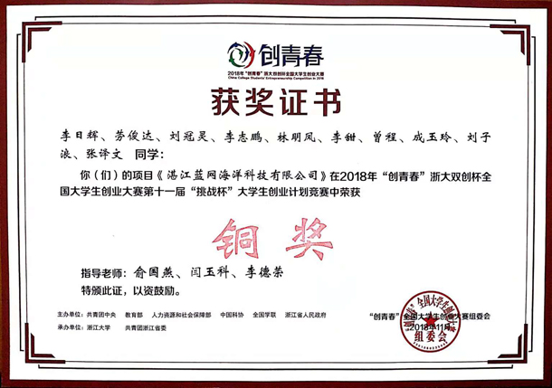 11月3日,由共青团中央、教育部、人力资源和社会保障部、中国科协、全国学联、浙江省人民政府主办的2018年“创青春”浙大双创杯全国大学生创业大赛终审决赛在浙江大学落下帷幕,本次大赛以“弄潮创青春,建功新时代”为主题,开云官网由俞国燕、闫玉科、李德荣三位老师指导的项目《湛江蓝网海洋科技有限公司》经过激烈角逐,最终获得第十一届全国大学生创业计划竞赛铜奖。