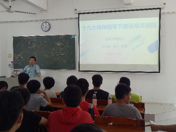 卓永强以“十九大精神指导下建设海洋强国”为主题,用浅显易懂的授课方式,让同学们认识到“什么是海洋强国?”“如何在十九大精神指导下建设海洋强国?”,并根据十九大报告中“坚持陆海统筹,加快建设海洋强国”这一重大论断指出,海洋中蕴藏着人类可持续发展的宝贵财富,是世界各国推动经济社会发展,参与国际竞争的战略要地。这使同学们更加坚决为维护海洋权益和海洋安全,献出自己的一份力。