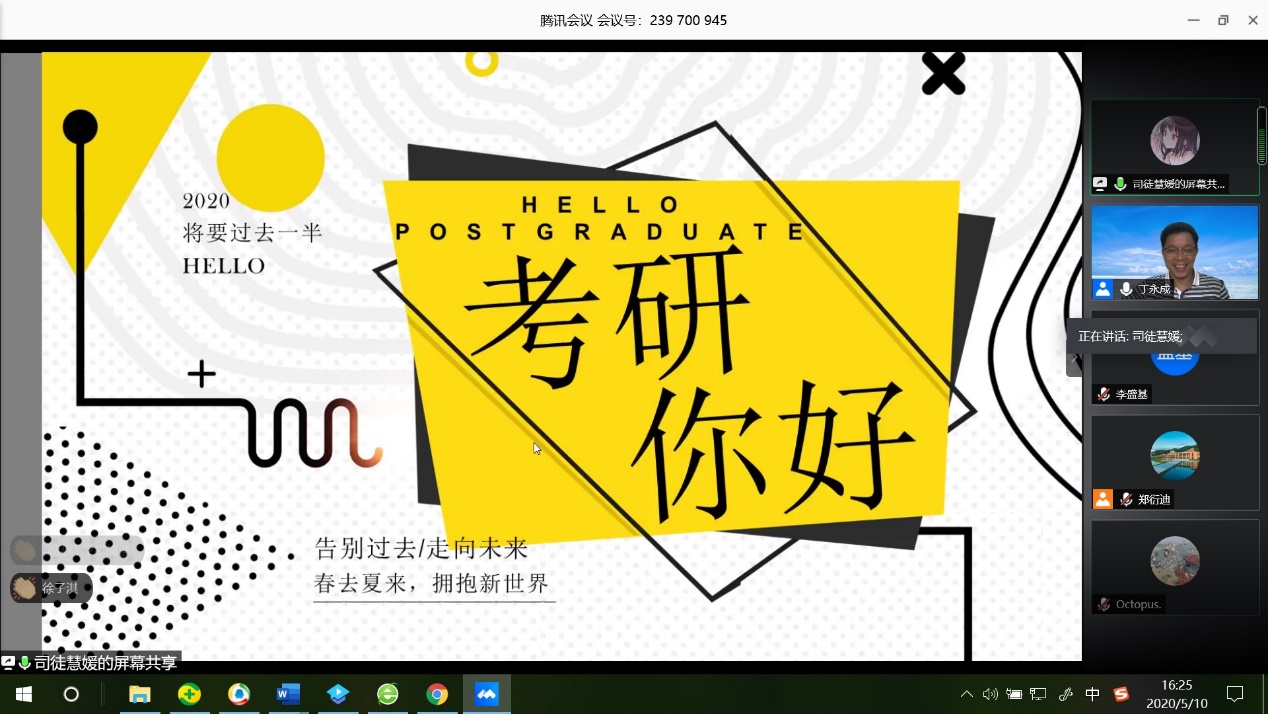 2019届罗国聪、张增江,2020届罗桂心、司徒慧媛等推免、考研优秀学生代表应邀在线上为大家分享考研经验。他们从如何看待考研、如何准备考研、如何选择学校和专业方向等方面介绍了自己的心得和学习方法,让同学们对考研有了进一步的认识、更加激发了考研热情、坚定了考研信心和考研目标。