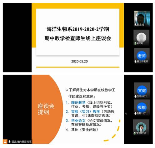 5月20日下午,水产学院海洋生物系在腾讯会议平台召开2019-2020-2学期期中教学检查师生座谈会。海洋生物系李长玲教授、温崇庆教授、夏立群教授、江东能副教授和吴天利老师,以及2016、2017、2018和2019级各班班长和学习委员等20余名学生代表参加了本次座谈会。座谈会由海洋生物系副主任田昌绪老师主持。