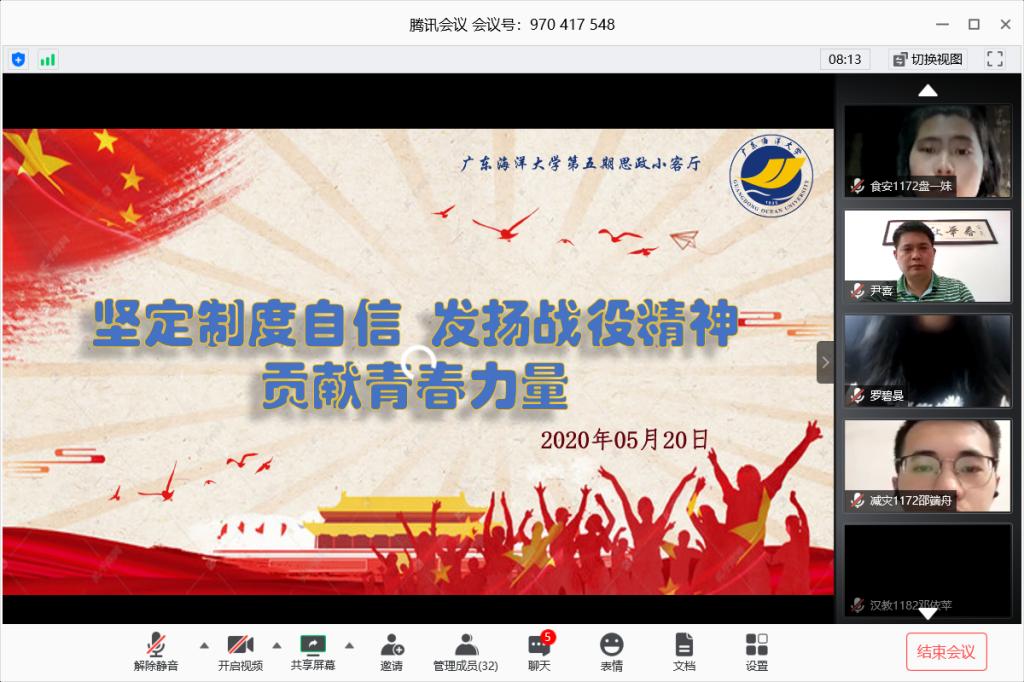 5月20日下午,第五期“思政小客厅”沙龙活动在腾讯会议举行,马克思主义学院副教授郭玉华博士、李林杰博士应邀作客“小客厅”,与部分班长、青年志愿者联合会成员、“思政小助理”近30名同学围绕“坚定制度自信,发扬战疫精神,贡献青春力量”主题展开交流活动。学生工作部部长尹喜参与了沙龙活动,“思政小助理”小组长周庆军主持活动。