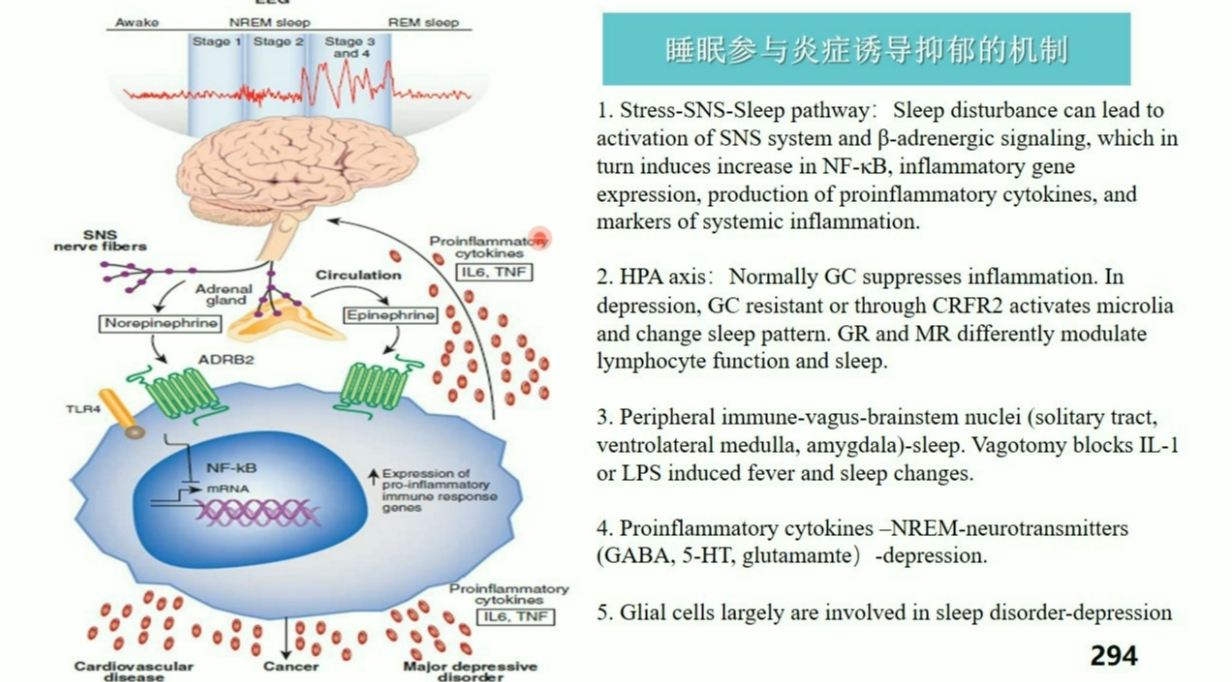 宋采教授以30多年来在精神神经免疫学科上面的潜心研究和做出的显著成果为基础,从大脑和免疫系统之间的交流,讲述睡眠障碍引起人体免疫系统的反应,从而诱导抑郁症的机制。证明了睡眠模式的改变和紊乱与抑郁/焦虑有着不可分割的联系。这些成果在睡眠障碍与抑郁症的研究中尚属前沿,获得国内外专家的好评。