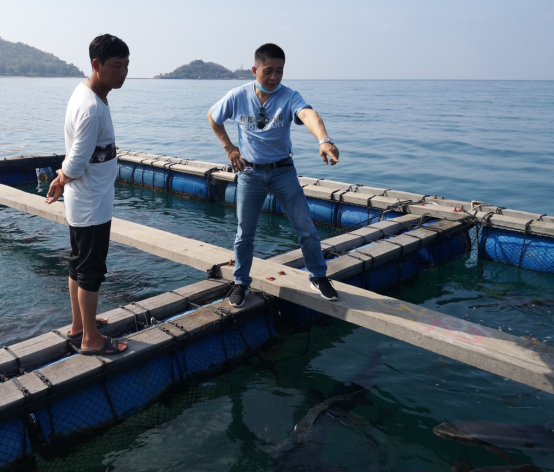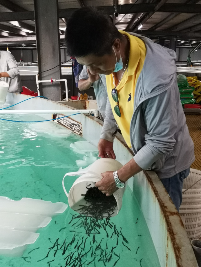 研究团队将培育的军曹鱼商品种苗分别赠送给茂名滨海新区宸熙生物科技有限公司和广东省海水鱼省级良种场(阳江)进行中间培育和开展室内工厂化循环水养殖第二年试验,助力养殖企业复工复产。团队采用选育耐低氧品系的亲鱼繁殖后代,可显著提高后代种苗的耐低氧能力。在疫情防控期间,团队通过亲鱼筛选、人工催产、受精卵生产、苗种培育、赠苗企业等技术服务活动等受养殖企业的好评,以实际行动诠释了疫情期间水产科技工作者的责任和担当。