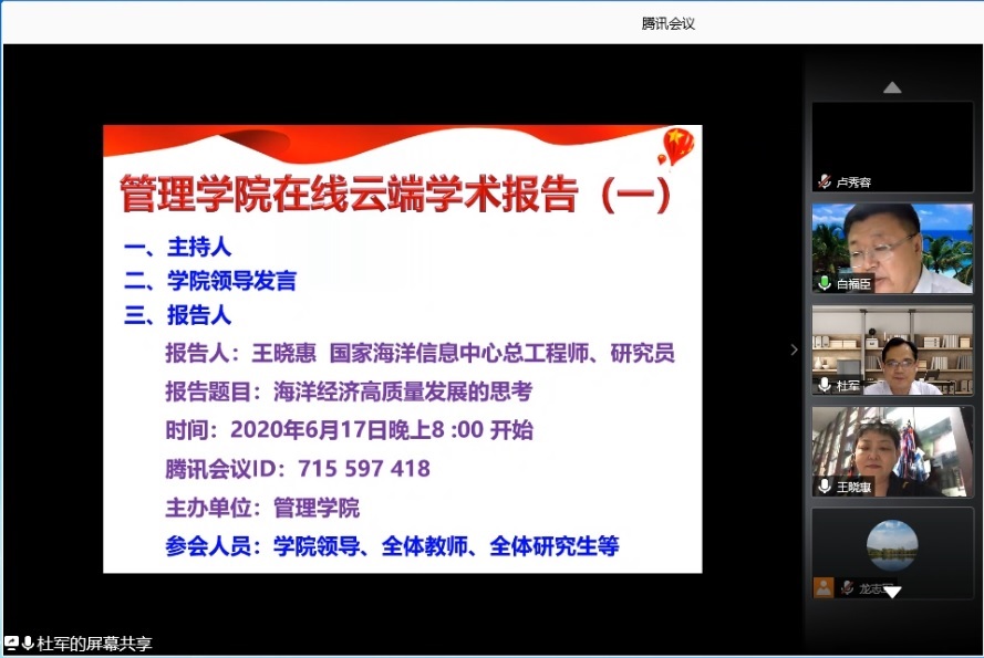 为进一步活跃科研学术氛围,鼓励和支持老师们、同学们结合自身优势投身于科学研究工作,推动海洋经济管理特色学科方向研究事业发展,6月17日晚,管理学院利用在线腾讯会议方式,邀请国家海洋信息中心总工程师王晓惠研究员为开云官网师生作了《海洋经济高质量发展》学术报告。管理学院领导、全体教师及研究生、兄弟学院师生等180余人参加了本次会议。会议由副院长杜军主持。