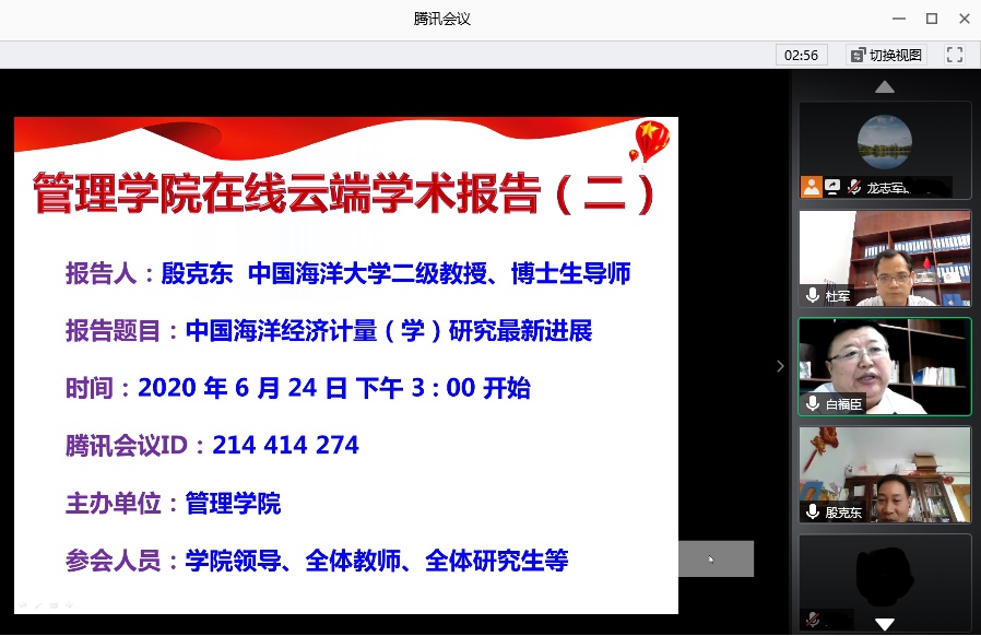 为了进一步推进海洋经济管理学科发展方向,活跃学院科学研究氛围,加强海洋类高校学术交流与合作,6月24日下午,管理学院通过腾讯会议举办线上专题学术报告。中国海洋大学二级教授、博士生导师殷克东应邀作了题为《中国海洋经济计量(学)研究最新进展》的学术报告。管理学院领导、全体教师及研究生等120余人参加了会议,副院长杜军教授主持会议。