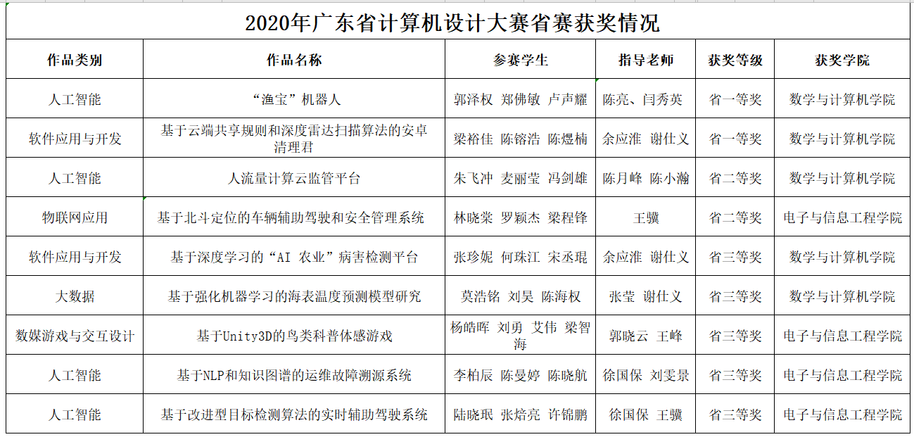 6月24日,由广东省教育厅主办的“2020年广东省大学生计算机设计大赛”落下帷幕。今年的比赛有来自广东省80多所本科院校共1129件作品参加。经过初评和复审两个环节,共评选出582件作品晋级省决赛。开云官网学子在比赛中不畏强手,奋力拼搏,最终获得广东省一等奖2项、二等奖2项、三等奖5项的好成绩。其中来自数学与计算机学院团队的《“渔宝”机器人》和《基于云端共享规则和深度雷达扫描算法的安卓清理君》两项作品勇夺省赛一等奖。