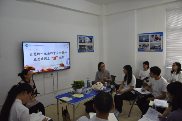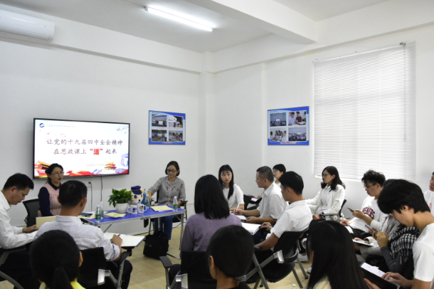 高良坚、郭玉华结合思政课教学实际,尹喜、黄晋结合学生工作实际,与同学们作了分享和交流。尹喜谈到,新时代海大人要强化使命担当,深入学习贯彻党的十九届四中全会精神,把全会精神内化于心、外化于行,关心国家大事,坚定制度自信。“思政小助理”要积极发挥思想引领的作用,推动十九届四中全会精神学习宣传贯彻落实。黄晋谈到,作为当代大学生,要深刻领会十九届四中全会精神实质,以实际行动推动思政课堂“活”起来,推动学校建设发展。