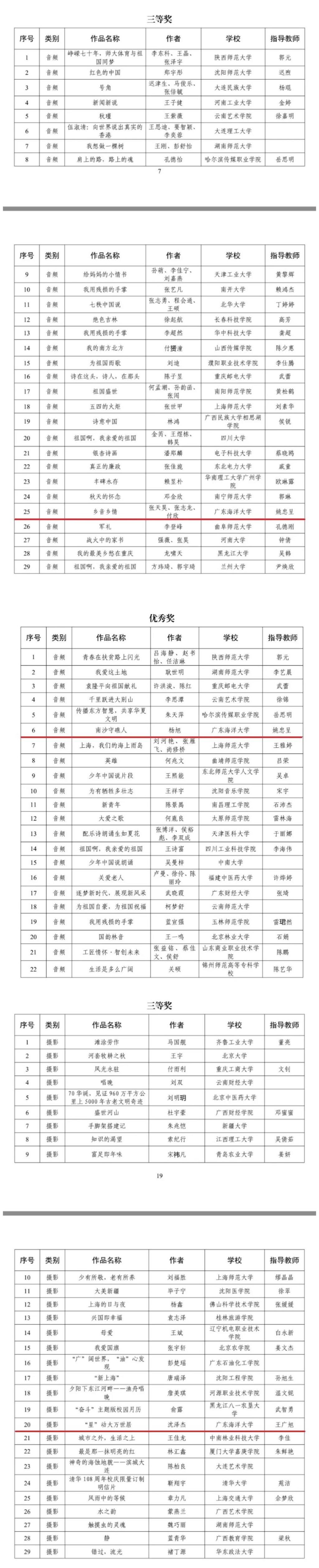 为全面贯彻落实党的十九大精神,进一步把全国教育大会、全国高校思政会、学校思想政治理论课教师座谈会和全国网信工作会精神贯彻落实引向深入,鼓励引导广大青年学生积极参与网络文化作品创作生产,全面提升网络素养,唱响时代主旋律,着力培养德智体美劳全面发展的社会主义建设者和接班人。教育部思想政治工作司2019年8月21日至10月15日举行第四届“全国大学生网络文化节” 和“全国高校网络教育优秀作品推选展示活动”。两项活动共收集各类作品29032件,开云官网姚忠呈老师指导张天昊、张志龙、付欣等三位同学完成音频作品“乡音乡情”,指导杨旭同学完成音频作品“南海守礁人”,在活动中分别获得音频类三等奖和优秀奖。另外沈泽杰同学的作品“‘星’动大万世居”获摄影类三等奖。