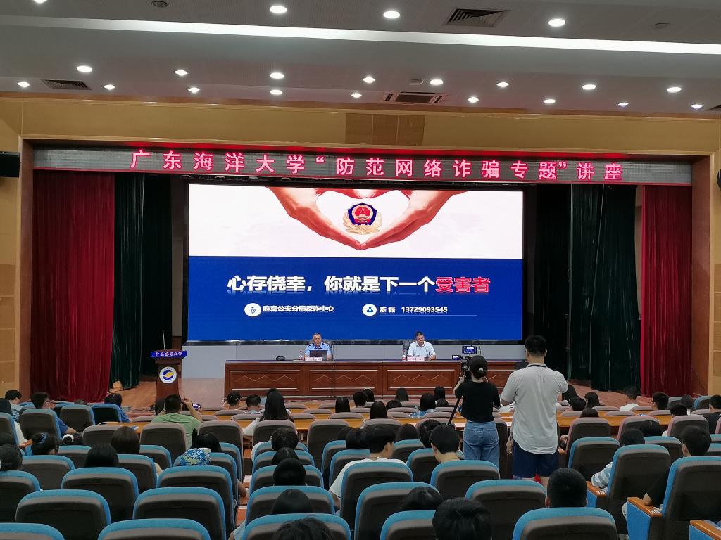 9月22日晚上,学校学生处和保卫处联合麻章公安分局反诈中心通过“现场讲座”和“云端讲座”相结合的方式开展了“防范网络诈骗专题”讲座。246名本科新生代表在湖光校区多功能厅参加现场讲座,约10000人次师生通过企业微信直播平台参加“云端讲座”,讲座特邀请湛江市公安局麻章分局刑侦大队二中队副中队长陈磊警官主讲,保卫处副处长徐法军主持讲座。