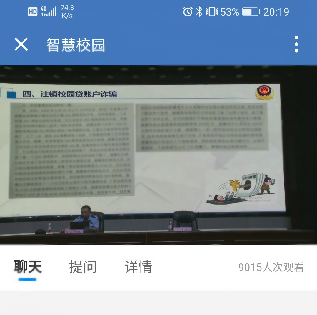 陈警官结合近期的刷单诈骗,快递包裹丢失诈骗,贷款诈骗,注销校园贷诈骗和游戏账号诈骗等典型案例向师生解读电信诈骗违法犯罪的特点和作案手段,特别是对网络刷单诈骗、贷款类诈骗、购物类诈骗的违法犯罪手段进行警示,提醒师生不要在网上透露个人信息、不点开不明链接等,要第一时间报警,遇到可疑情况及时拨打报警电话110或3258452(湛江市反诈中心电话),以免遭受不法侵害。
