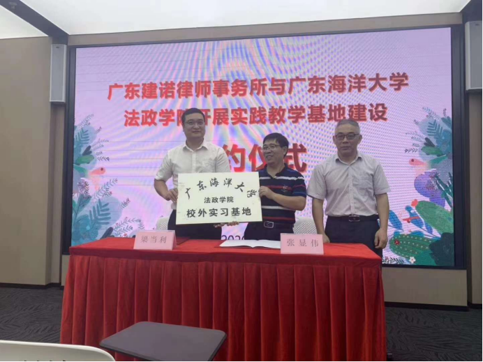 9月26日上午,法政学院院长张显伟、教授杜承秀、实践教学中心主任胡余旺来到广东建诺律师事务所,与该所领导共同举行校外实习基地签约挂牌仪式。张显伟一行受到律所主任梁当利等同志的热烈欢迎。在签约挂牌仪式上,张显伟介绍了法政学院的发展历程、学科专业建设、法律硕士招生教学及社会服务等情况,希望建诺所为学院学生实习实践提供更好的条件。梁当利主任介绍了建诺所的基本情况,建诺所是广东省江门市颇具影响力的、拥有多个专业律师团队的大型律师事务所,有条件有能力配合完成法政学院部分本科生与研究生的实习实践教学任务。仪式前,张显伟教授还应邀作了《行政行为的合法性审查》的学术报告。