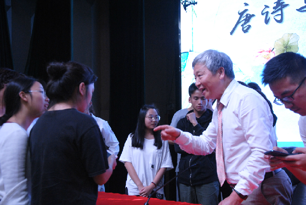 沈家庄以《送杜少府之任蜀州》、《雨霖铃》、《江城子》等脍炙人口的唐诗和宋词为例,从咏别情、诗人个人情感经历和诗词人友谊的角度,为现场学生赏析了唐诗和宋词之间不同的意蕴和魅力。并以词人李清照为例,讲述了宋代女性自我意识觉醒和思想意识的外在抒发和表现。沈家庄表示,宋词不仅反映出中国文学审美内涵的丰富性和审美品位的多样性,还反映出中国文化传统流变与承传的恒定性,中华民族文化在世界文化中自有其先进性。主讲结束后,沈家庄与现场师生进行了互动交流。