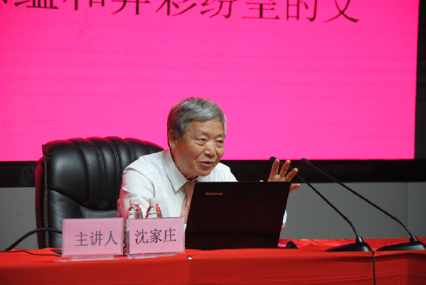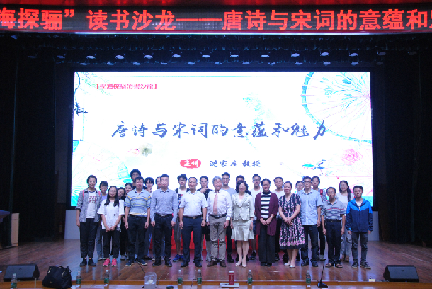 11月8日晚上,由图书馆主办,学生工作部、文学与新闻传播学院协办的第三十期“学海探骊”读书沙龙在湖光校区主楼多功能厅举行,共400多名师生参加了活动。本期沙龙由图书馆副馆长詹衍玲主持,主题为“唐诗和宋词的意蕴和魅力”,原广西师范大学文学院博士生导师沈家庄教授受邀主讲。