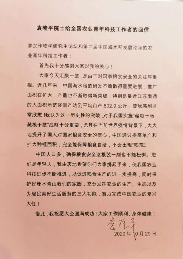 在10月29日论坛开幕式上,中国工程院院士、杂交水稻之父袁隆平在给全国农业青年科技工作者的回信中表示,希望大家携起手来,使我国农业科技进步不断推进,以促进粮食生产的进一步提高,同时保护好绿水青山我们的家园,充分发挥农业的生产、生态以及为居民美好生活服务的三大功能,努力完成中国农业的复兴大任!