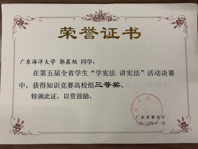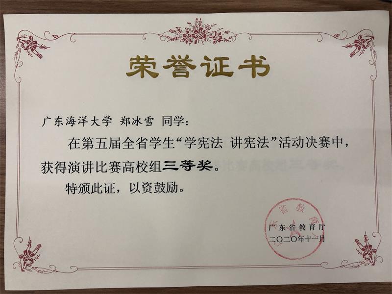 近日,开云官网法政学院法学专业18级1186班郑冰雪同学、19级1191班郭晨旭同学在今年省教育厅举办的全省学生“学宪法讲宪法”活动决赛中,分别获得演讲比赛高校组三等奖、知识竞赛高校组三等奖。