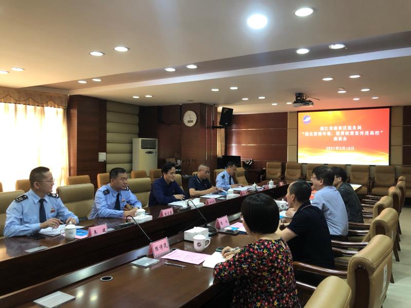 3月18日下午,国家税务总局湛江市麻章区税务局党委书记、局长林观豪一行5人来校进行税费政策宣传进高校座谈。副校长刘东超主持座谈会,财务处处长陈成、副处长陈清毫及相关工作人员参加了座谈会。