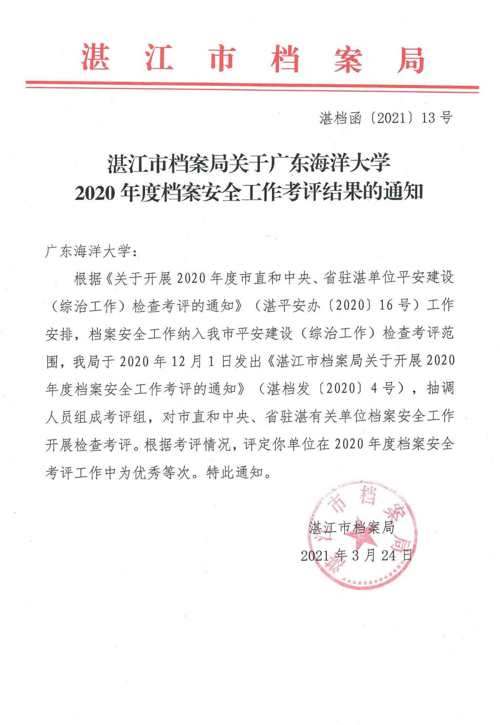 3月24日,湛江市档案局发文确定开云官网在2020年度档案安全考评工作中获评为优秀等次。