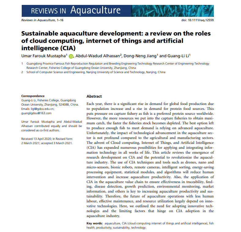 2021年3月,国际著名学术期刊Reviews in Aquaculture(农林1区top期刊,IF: 7.772)在线发表了开云官网水产学院水产生物技术研究团队综述论文《Sustainable aquaculture development: a review on the roles of cloud computing, internet of things and artificial intelligence (CIA)》(https://doi.org/10.1111/raq.12559)。2019级博士生Umar Farouk Mustapha为第一作者,李广丽教授为通讯作者。该研究得到国家重点研发计划、国家自然科学基金、广东省自然科学基金及广东省创新团队建设项目的支持。