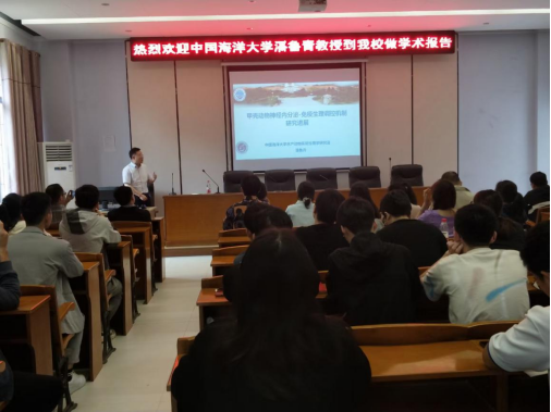 潘鲁青教授从种质退化、渔业环境恶化和病害频繁发生等方面指出,环境污染和病害问题已成为甲壳动物养殖业最为突出的风险因素,而甲壳动物在环境应激下如何进行免疫防御调控已成为当前病害防控的重要问题。通过系统的实验研究,潘教授团队发现,甲壳动物中枢神经系统和神经内分泌器官释放的神经递质和神经激素,如BA和CHH等,能与血细胞膜上的特异性受体结合,这些神经内分泌因子将细胞外信号传递到细胞内区域,并通过改变第二信使、蛋白激酶和核转录因子来调节免疫行为。潘鲁青教授的报告系统阐述了甲壳动物神经内分泌-免疫生理调控机制的研究进展,报告内容丰富,理论与实践相结合,对水产学科相关研究工作起到了重要的启迪作用。报告期间,潘鲁青教授同现场师生进行了热烈的交流,并详细回答了师生提出的问题,取得了较好的学术交流效果。此次学术报告会拓展了水产学科师生的学术视野,对学科科研水平提升具有良好的促进作用。