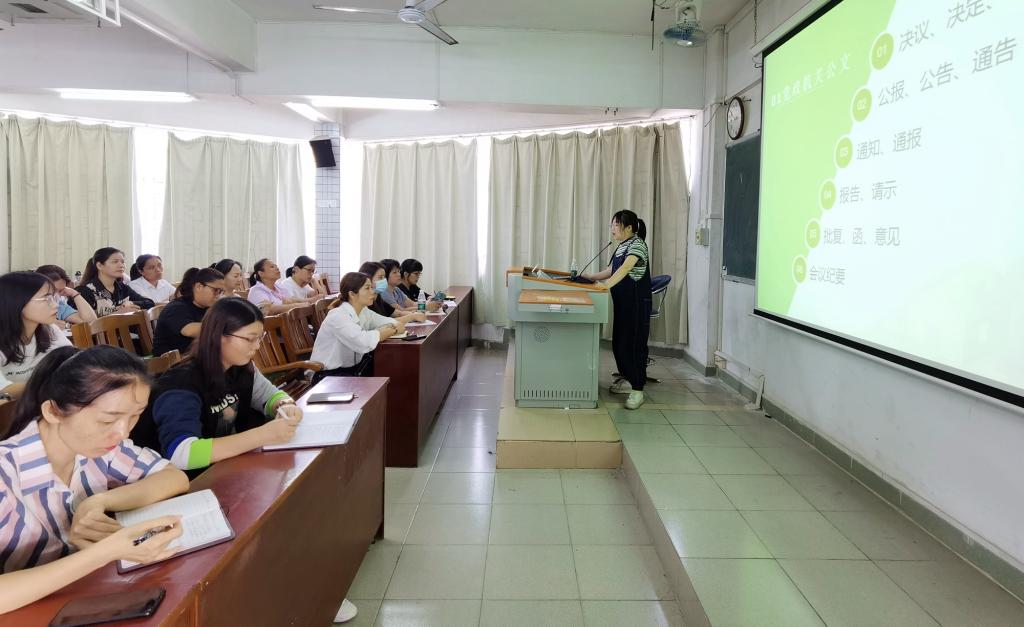 莫春艳就应用文的分类、基本格式、写作标准和写作技巧等方面进行了详细的讲解。她还结合自身的工作和写作经历,通过对新华社、人民日报、学校网站和后勤集团公众号等新闻稿件和推文进行点评的方式,用通俗的语言、鲜活的例子将“传统新闻、公众号推文和总结(报告、述职)”三种文体的结构特点、写作逻辑和写作技巧进行了深入浅出的讲解。