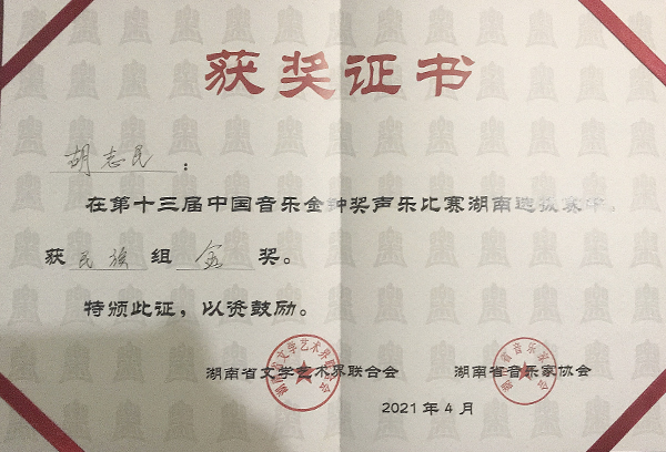 中歌艺术学院研究生胡志民喜获中国音乐金钟奖选拔赛湖南赛区金奖