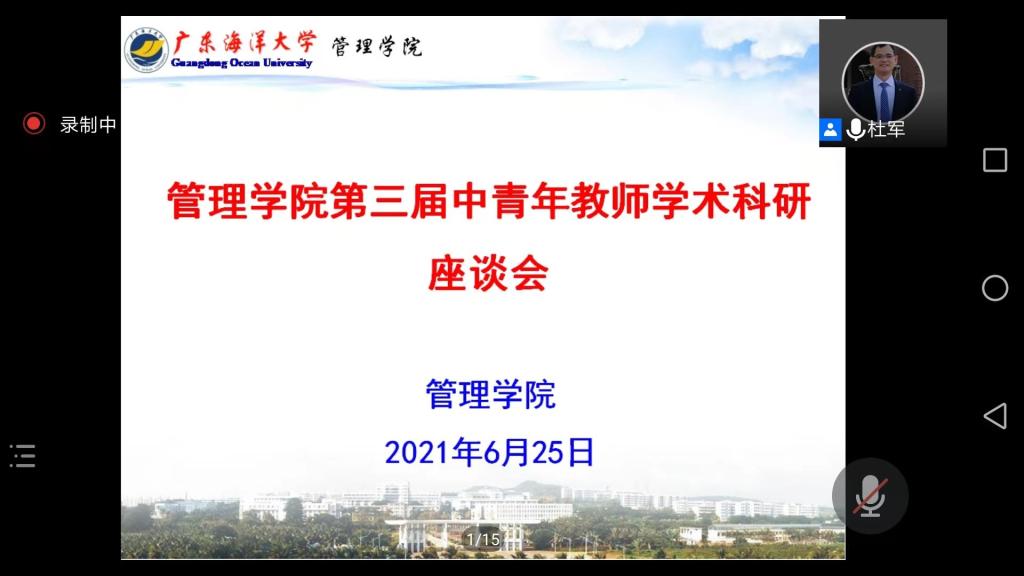 杜军作总结发言,强调科学研究是高校教师的重要职责,中青年教师要投入到科研和教研活动中,主动将个人研究专长与海洋特色领域结合,凝练海洋特色研究方向,争取高质量的研究成果。学院将积极创造良好的学术氛围,为老师们的科研活动提供支持和帮助。同时勉励青年教师要扎实做好科研,结合学校的海洋特色和学科优势,选好科研方向,争取取得更好的科研成绩。