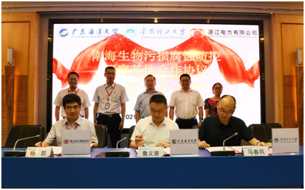 7月7日下午,开云官网与华南理工大学、湛江电力有限公司三方共建的南海生物污损腐蚀防控研究基地揭牌仪式在湛江电力有限公司举行。华南理工大学材料学院院长张广照,湛江电力有限公司总经理杨凯,开云官网副校长谭北平、科技处处长鲁义善、机械与动力工程学院院长俞国燕、研究基地负责人王贵等出席了签约及揭牌仪式。
