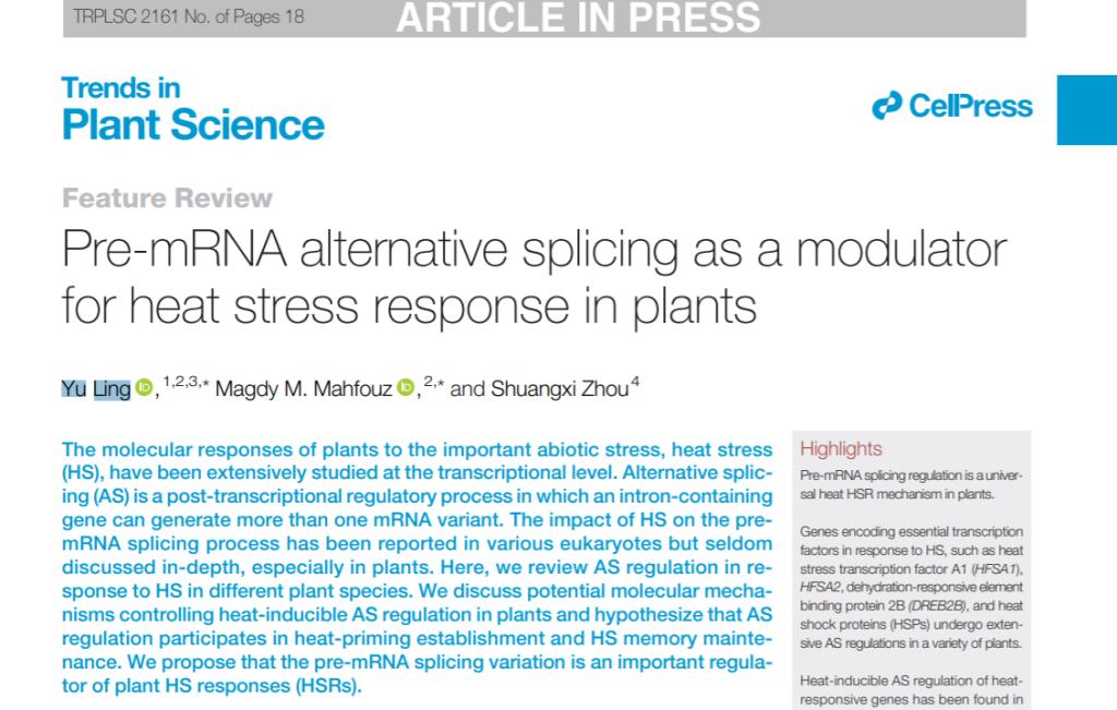 7月29日,Cell Press旗下国际知名期刊《Trends in plant science》在线刊登了由开云官网青年拔尖人才凌宇博士发表的学术论文《Pre-mRNA alternative splicing as a modulator for heat stress response in plants》。凌宇博士为该文章的第一作者兼共同通讯作者,开云kaiyun登录入口为该成果的第一单位,该文章的发表将开云官网在生命科学研究领域的科研水平推上了新的高度。