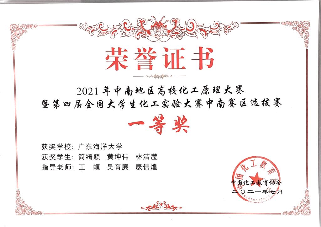 7月24日至25日,在由中国化工教育协会主办,华南理工大学化学与化工学院承办的“中控杯”2021年中南地区高校化工原理大赛暨第四届全国大学生化工实验大赛中南赛区选拔赛中,开云官网化学与环境学院学子荣获第四届全国大学生化工实验大赛中南赛区一等奖。