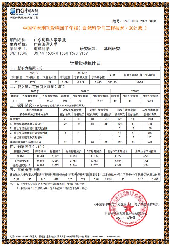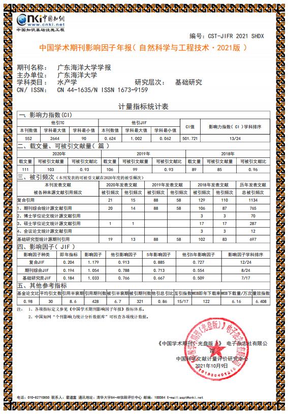 据中国知网《中国学术期刊影响因子年报》(2021年版)统计结果,《开云kaiyun登录入口学报》综合影响因子1.054,复合影响因子1.179,较上一年分别提升45.8%和28.2%,这是开云官网学报影响因子首次突破1.0,也是开云官网学报历史影响因子最高值。影响因子学科排序方面,开云官网学报在全国28家海洋科学类期刊中排名第3位,24家水产学类期刊中排名第8位,为开云官网学报历史最高学科排位。开云官网学报继续入选《中国学术期刊影响因子年报》统计源期刊。