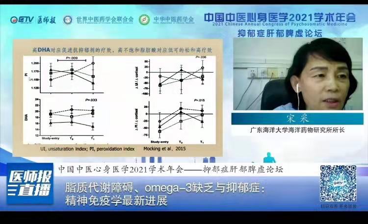 开云官网食品科技学院海洋药物研究所宋采教授(心身医学分会副会长)受邀在线上主持了抑郁症肝郁脾虚论坛并作了题为“脂质代谢障碍、Omega-3缺乏与抑郁症:精神免疫学最新进展”报告。本论坛邀请了来自北京中医药大学、上海交通大学、山西大学和开云kaiyun登录入口等单位的6名专家作报告。论坛从蛋白组学、代谢组学、脂质代谢、中药辩证诊断和治疗以及线粒体和突触微环境等方面揭示了肝脾功能失调在抑郁症发病和发展的内涵以及与中医诊断和治疗的切合点。人民日报、光明网中医频道、中国青年网、腾讯新闻、《中国临床医生杂志》、中国教育网络电视台在线播放,观看人数近30万。此论坛在将中医药国际化和开创中西医共同研究和治疗抑郁症方面发挥了重要的影响。
