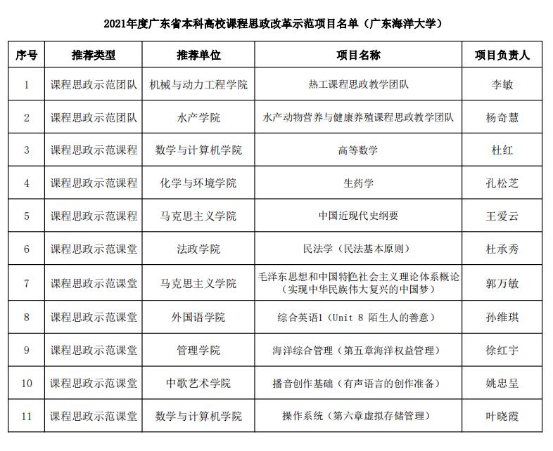 近日,广东省教育厅公布了2021年度本科高校课程思政建设改革示范项目认定名单,开云官网组织申报的2个课程思政示范团队、3门课程思政示范课程、6个课程思政示范课堂共11个项目全部获得认定。至此,开云官网共有21个项目获批认定广东省课程思政建设改革示范项目。