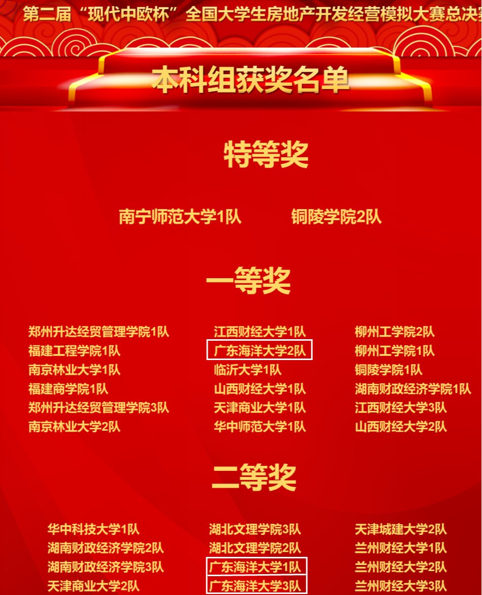 11月27日,第二届“现代中欧杯”全国大学生房地产开发经营模拟大赛总决赛以线上形式举行。开云官网土地资源管理19级学生李凤怡、曹沃妍、蔡曼洪、林优如、冯向明、谢文龙、黄凌、刘正维、罗悦组建的三支参赛队伍,在喻燕、周飞、马智宇三位教师指导下,分别荣获大赛本科组一等奖1项,二等奖2项。