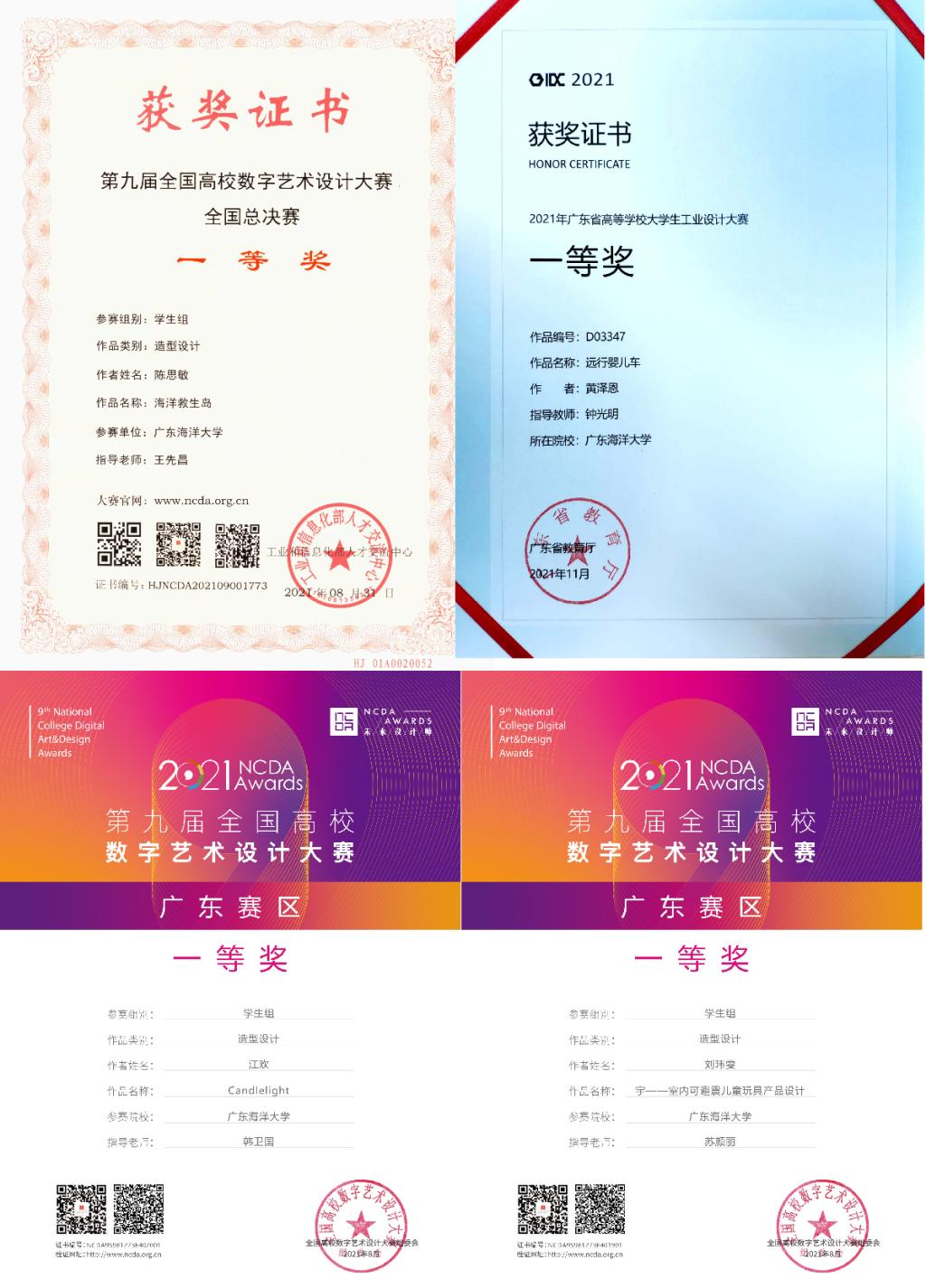 本年度,工业设计系教师结合课程教学实际情况,依托工业设计系小家电工作室、家具设计工作室、陶瓷陶艺工作室、文创产品工作室,以专业能力培养达成度为目标,指导学生参加专业设计比赛,取得了良好效果。其中18级保研生陈思敏同学设计的《海洋救生岛》(指导老师:王先昌)从参赛的119785份作品中脱颖而出,获得全国高校数字艺术设计大赛总决赛一等奖。刘玮雯同学设计的《室内可避震儿童玩具产品》(指导老师:苏颜丽)、胡丹阳设计的《多功能生活轮椅》(指导老师:苏颜丽)、江欢同学设计的《Candleight》(指导老师:韩卫国)获得广东省一等奖;黄泽恩同学设计的《远行婴儿车》(指导老师:钟光明)获得广东省大学生工业设计大赛一等奖。苏颜丽老师带领学生团队创作的《红土文化特色陶瓷创意产品设计与制作》(学生:凌艺华、龙才玲、杨诗辉、彭千华、吴念)获得2021年广东省妇女手工创业创新大赛优胜奖。学生们参赛热情高涨,并在中英国际创意大赛、ICAD国际当代青年美术设计大赛、CADA日本概念艺术设计奖等国际性赛事中斩获银奖、铜奖等多项奖项。