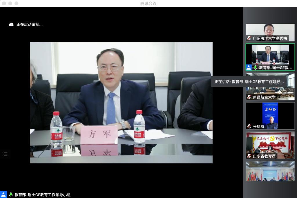 教育部国际合作与交流司副司长方军出席会议并讲话,与高校毕业生就业协会会长、教育部—瑞士GF教育合作工作领导小组组长王路江、教育部国际合作与交流司欧洲处处长赵磊、教育部中外人文交流中心副主任杨晓春、瑞士驻华大使馆经济参赞雷毅夫(Yves Reymond)等在线下会场共同见证启动仪式。