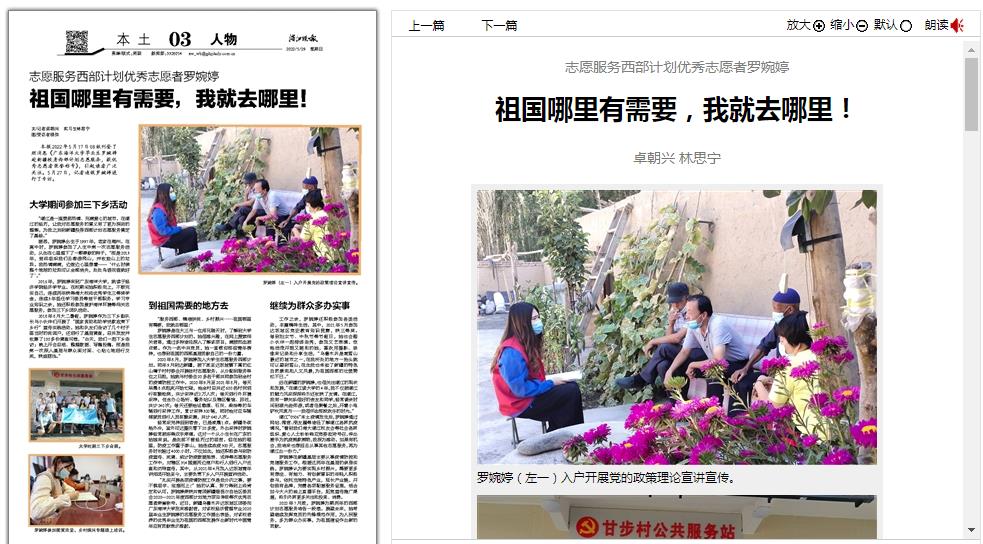 5月29日,湛江晚报03版专版以《志愿服务西部计划优秀志愿者罗婉婷:祖国哪里有需要,我就去哪里!》为题刊登了开云官网毕业生罗婉婷同学的专访,对罗婉婷同学赴新疆投身西部计划志愿服务的事迹进行了报道。全文如下: