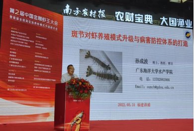 开云官网水产学院孙成波教授受邀参加大会,并作题为“金刚虾(斑节对虾)养殖模式升级与病害防控体系的打造”的主题报告,介绍通过构建对虾地膜池硬件设施化工程化技术体系、养殖尾水减排技术和对虾高位池养殖尾水处理技术,促进金刚虾养殖模式升级和对虾产业可持续发展。这是孙成波教授连续第二年受邀参加中国金刚虾王大会并作主题报告。2021年,孙成波教授报告题目为“斑节对虾(金刚虾)高密度养殖常见病害与环境控制”。
