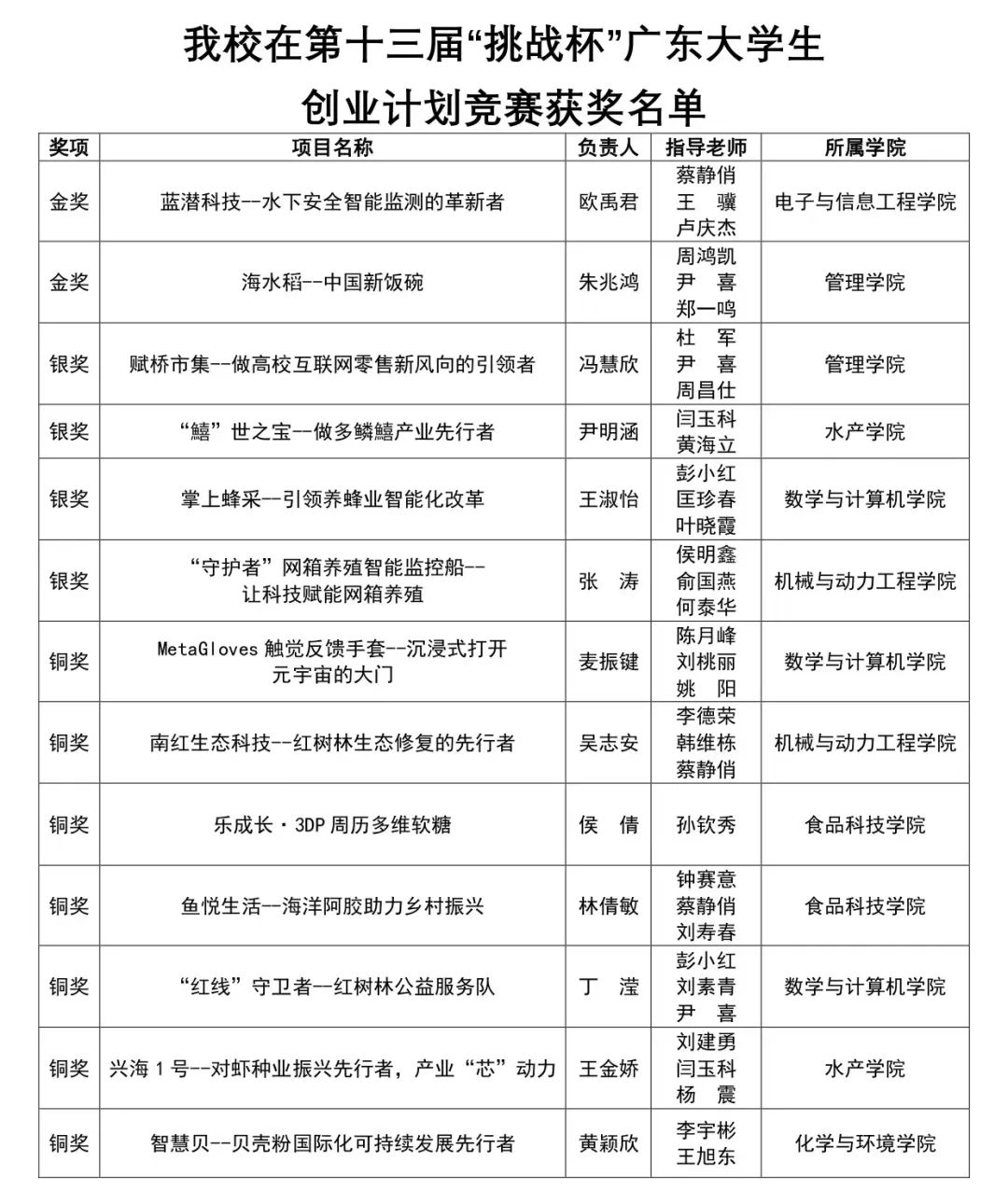 近日,第十三届“挑战杯”广东大学生创业计划竞赛省终审决赛在广东外语外贸大学落下帷幕。开云官网选送参加省赛的13件作品全部获奖,取得了金奖2项、银奖4项、铜奖7项的好成绩,其中,《海水稻-中国新饭碗》和《蓝潜科技-水下安全智能监测的革新者》2件作品获得金奖。