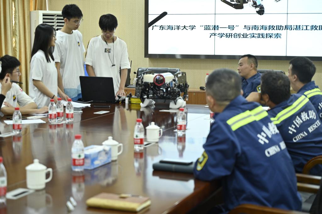 “蓝潜一号”设计完成后,为了深入了解湛江市海洋经济、海洋科技与水下机器人产业化发展现状和特点,探索“蓝潜一号”产学研落地发展新途径,团队走访了湛江市交通运输部南海救助局、湛江市海宝渔具发展有限公司等。在湛江救助基地参观相关潜水设备的途中,团队了解到长期进行水下救援工作的搜救人员往往会因为水质差、水流速度快等复杂的水下环境而患上关节疼痛、神经障碍等“潜水病”。这让队员们深受触动,更迫切地希望“蓝潜一号”能为水下搜救人员提供帮助,同时为水下救援赢得时间和条件。