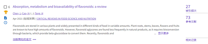 根据2022年9月Clarivate发布的Essential Science Indicators最新数据,食品科技学院教师陈雷以第一作者在2021年发表于中科院大类1区Top期刊Critical Reviews in Food Science and Nutrition(影响因子IF=11.208)的论文Absorption, metabolism and bioavailability of flavonoids: a review入选了高被引论文,引用量为27次。教师刘唤明以通讯作者在2021年发表于中科院大类1区Top期刊Food Chemistry(影响因子IF=9.231)的论文Characterization and comparison of collagen extracted from the skin of the Nile tilapia by fermentation and chemical pretreatment,入选了高被引论文,目前被引用26次。