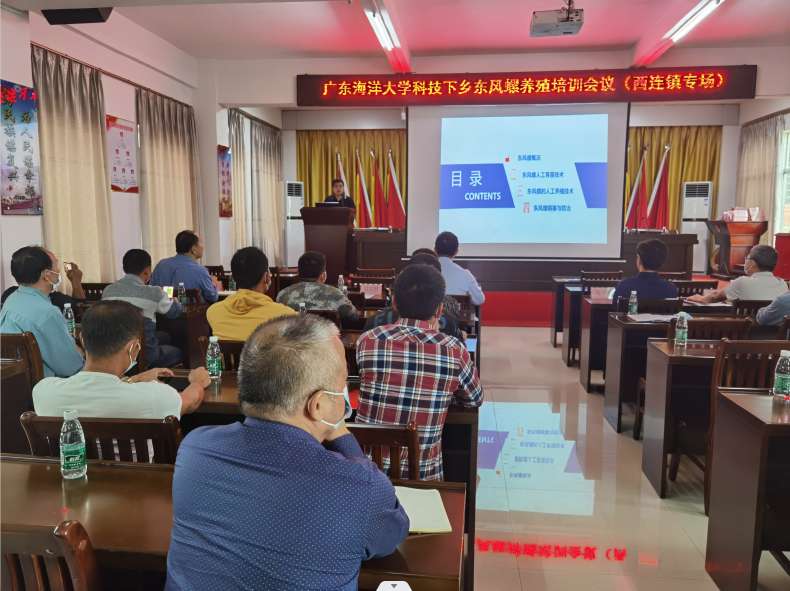 吕文刚博士为当地东风螺养殖户做了“东风螺育苗与养殖”的技术讲座,详细讲解了东风螺人工育苗技术、东风螺人工养殖技术、东风螺病害与防治等知识。讲座内容切合养殖实际,为养殖户提供了科学养殖的技术指导。