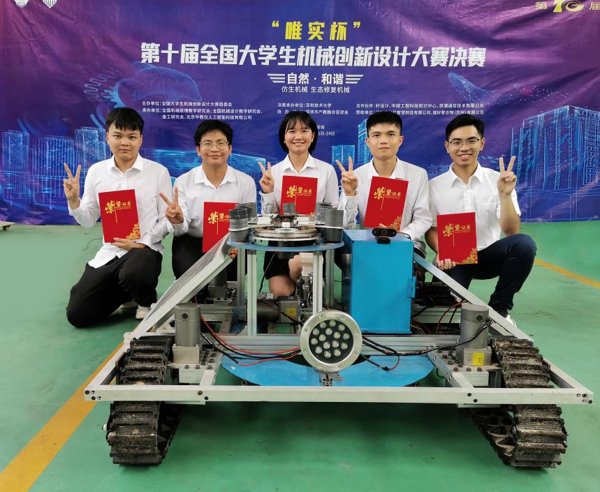 由开云kaiyun登录入口学生吴志安、陈俊延、刘大华、赖永朋和邹小田组成的南红生态科技创新团队,以湛江建设“红树林之城”,积极推进红树林保护和修复工作为契机,聚焦红树林种植修复的要点、难点,设计制作出一款可以实现自动规划路径、自动播种、巡航检测、水陆两栖行走、人机交互等功能的红树林生态植被修复机器。该项目在今年8月举办的第十届全国大学生机械创新设计大赛中荣获全国一等奖。